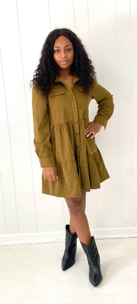 Step into the season in effortless style with our Sage Season Dress! This olive green beauty blends cozy texture with timeless charm, featuring soft corduroy fabric and a flattering tiered silhouette. The button-up front and long sleeves make it the perfect piece for crisp fall days, while the earthy sage hue adds that touch of natural warmth every wardrobe needs.