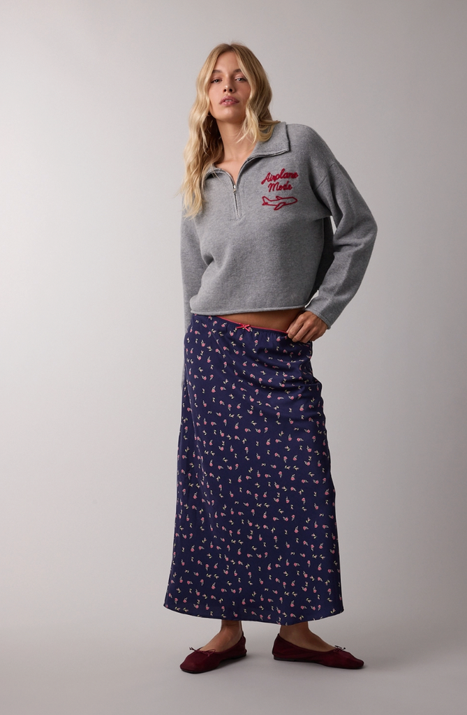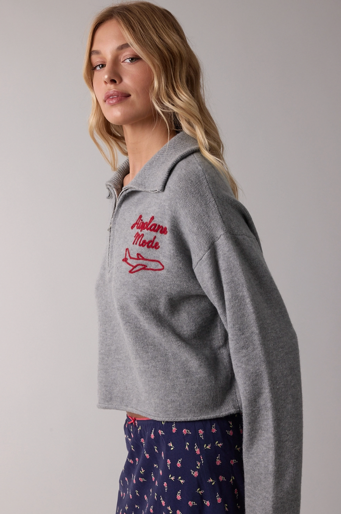 A timeless sweater, perfect for all of your travels this holiday season! The Airplane Mode Soft Half Zip Sweater is just what you need for a day spent on holiday.Featuring a half zip, light grey color, rolled hem and sleeves, red 'airplane mode', slightly cropped hemline, lightweight knit fabric and a slouchy fit.