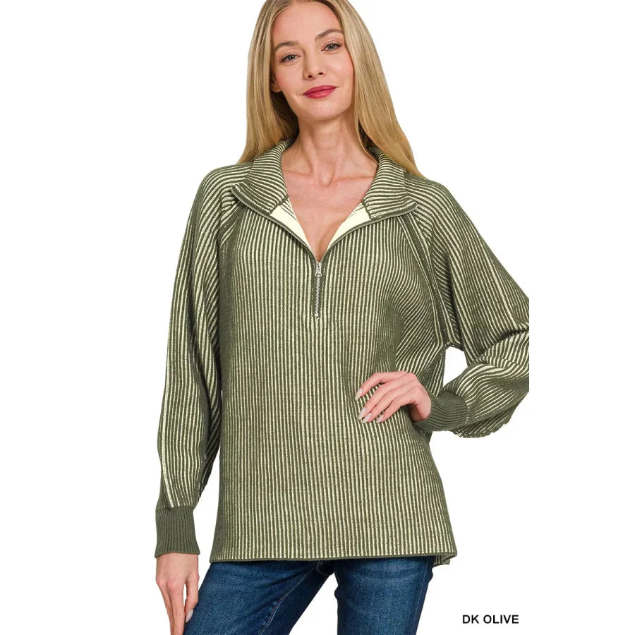 Stay cozy and stylish in this ribbed two-tone half zip sweater. The unique two-tone design adds a modern twist to the classic ribbed knit construction. Featuring a half zip closure, this sweater offers versatility in styling and temperature control. The ribbed texture adds depth and interest to the look, while providing a snug and comfortable fit. Perfect for layering or wearing on its own, this sweater is a versatile piece that can be dressed up or down for any occasion. Elevate your cold-weather wardrobe with this chic and on-trend ribbed two-tone half zip sweater.