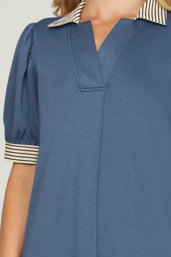 The “Benson Dress” is a piece that you'll love having in your closet. It's effortlessly polished and easy to wear. The body is crafted from a soft knit blend fabric (hello comfort!), while a preppy seersucker stripe contrast trims the standing ruffle collar, button placket, and puff sleeves. Dress it up with gold flats, or wear it with sneakers for a more casual look… You can't go wrong here! offered in 3 colors